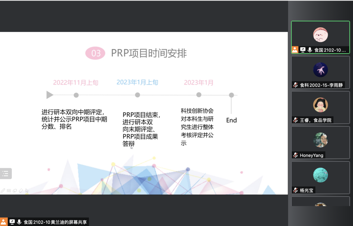 近日,2021级PRP项目宣讲会在线上成功举行。食品学院竞赛辅导员杨光宝、2021级本科生辅导员张任,部分往届PRP项目代表,以及全体2021级本科参与活动。