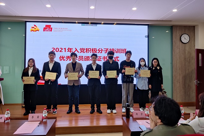 随后,胡卉君为2021年入党积极分子培训班优秀学员颁发证书。优秀学员代表徐嘉辰分享了参加入党积极分子培训班的学习经历,号召全体学员时刻保持思想的先进性,不断提高党性修养和理论素养,自觉开展批评和自我批评。2021级本科生谢璐羽代表全体学员郑重承诺,将以最饱满的热情,最全面的投入,最实际的行动完成党课学习,遵守培训纪律,时刻以党员的标准严格要求自己,争取早日加入党组织。