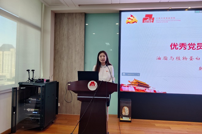 油脂与植物蛋白研究中心博士党支部书记韩宛君作为优秀党员代表发言,她分享了“入党为什么,在党干什么,为党留什么”的问题。她表示,面对百年未有之大变局,作为入党积极分子,应始终坚定理想信念,练就过硬本领,勇于创新创造。