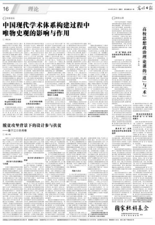 2019年5月8日,《光明日报》理论版刊发了我校 “研究阐释党的十九大精神”国家社科基金重大专项课题“打赢脱贫攻坚战跟踪评估研究”首席专家、商学院谢玉梅教授的研究成果《脱贫攻坚背景下的设计参与扶贫——基于江口的考察》一文,这是谢教授第2次在《光明日报》发表理论文章。文章结合我国脱贫攻坚背景,对设计扶贫概念和内涵进行了界定,基于对贵州省江口县的考察,提出随着贫困地区人居环境、人口结构、生活方式和价值观念改变,设计参与扶贫对建立稳定脱贫长效机制的重要性。