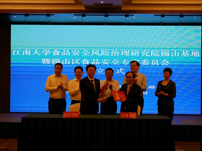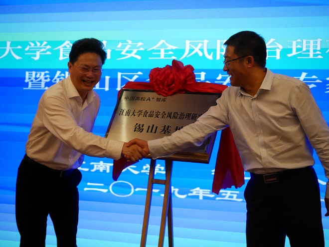 5月24日下午,我校江苏省重点培育智库——“江南大学食品安全风险治理研究院”锡山基地暨锡山区食品安全专家委员会成立仪式在锡山区举行。江南大学副校长陈卫,无锡市市场监管局党组书记、副局长邵鹤鸣,锡山区委副书记言国强、副区长胡小坚,江南大学商学院党委书记李佳敏、省食品安全风险治理研究院团队成员以及锡山区政府办公室、区委宣传部等区委办局主要负责人出席活动。