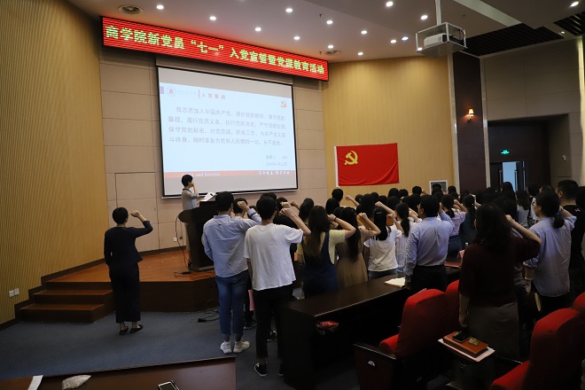 活动在庄严的国际歌声中开始。首先举行新党员入党宣誓仪式,李荣华副书记领誓,84位学生预备党员面向党旗庄严宣誓,表达对党忠诚、永不叛党和愿意为共产主义事业奋斗终身的决心;其他党员师生重温入党誓词,牢记入党初心,筑牢信仰之基,担当时代使命。