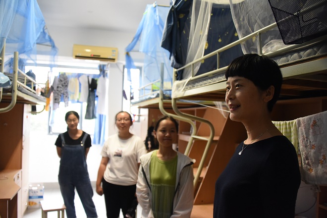 访新生宿舍,话崭新生活。8月29日班会后,院党委书记李佳敏、院党委副书记、副院长李荣华带队全体新生班主任、辅导员开展走访2019级新生宿舍活动,学院领导和老师们走出办公室,走进学生宿舍楼宇,与新生面对面交谈。敲开宿舍门的一瞬,略显紧张和拘谨的新生同学,随后便在老师们充满亲和力与幽默的问候与交谈中迅速拉近了彼此之间的距离。在与走访宿舍的新生交流过程中,院领导和班主任老师们关心新生是否适应新的生活环境、提醒宿舍成员相处要和睦包容,同时提醒新生能立自我防范意识,遵守宿舍规定,不要使用违章电器。正如李荣华副书记走访宿舍过程中所说的,“和谐正向的宿舍环境,对大学学习与生活起到重要作用,希望同学能尽快适应新的生活环境,建立良好和谐的人际关系,开启美好大学新生活!”