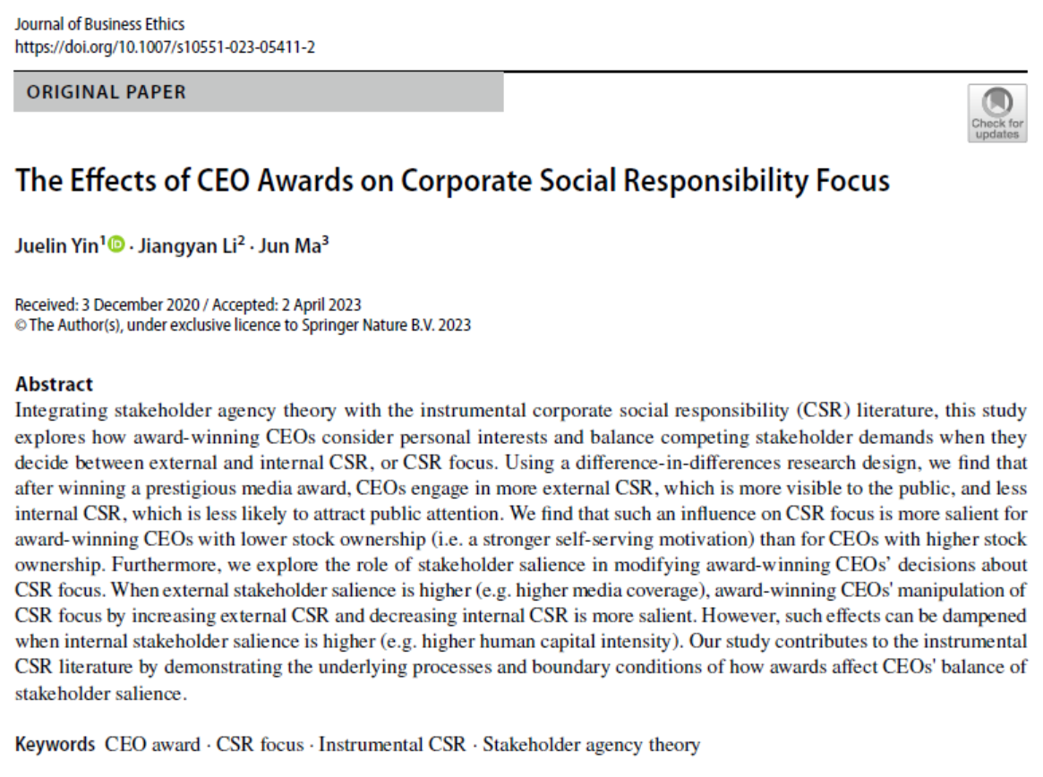 近日,国际权威期刊《Journal of Business Ethics》在线发表了商学院马骏副教授与合作者共同完成的论文“The Effects of CEO Awards on Corporate Social Responsibility Focus”(CEO获奖对企业社会责任关注重点的影响效应)。