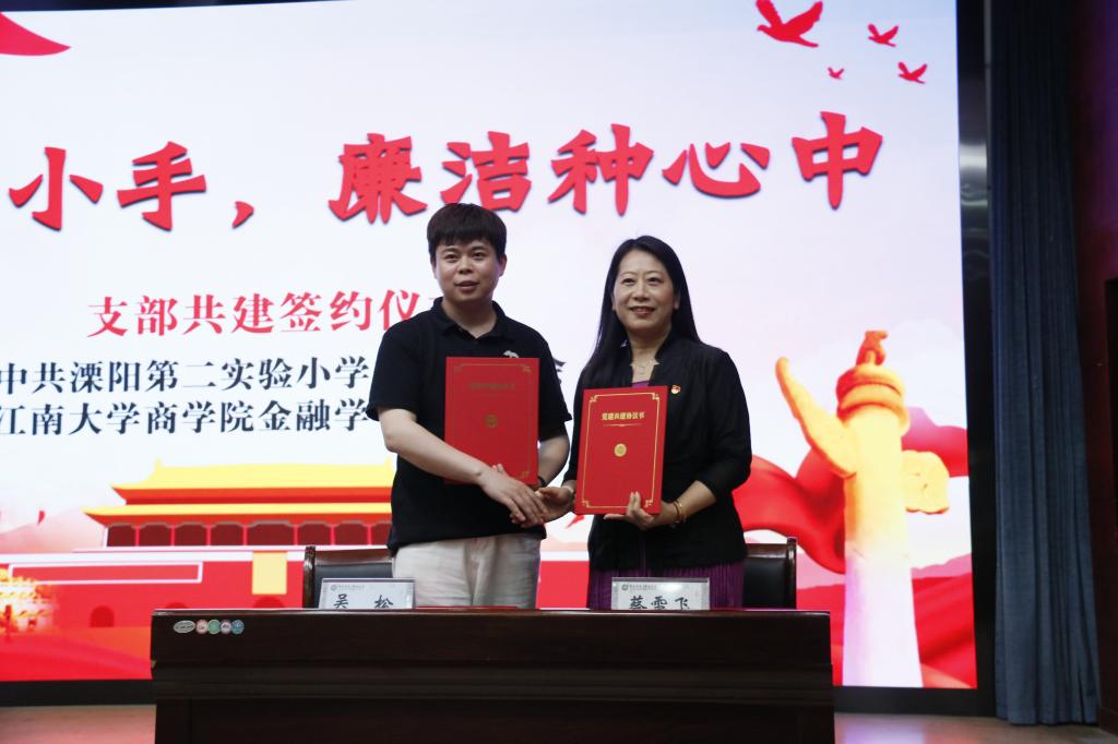 之后,在双方党员的见证下,中共溧阳市第二实验小学支部委员会与中共江南大学商学院金融学学生支部委员会开展“大手拉小手,廉洁种心中”的党建联盟签约共建仪式。
