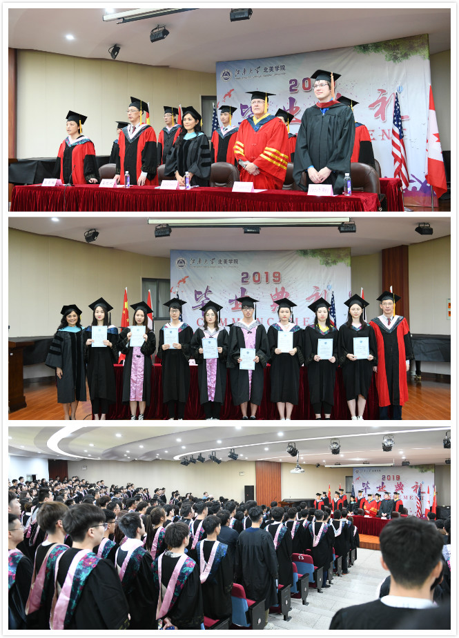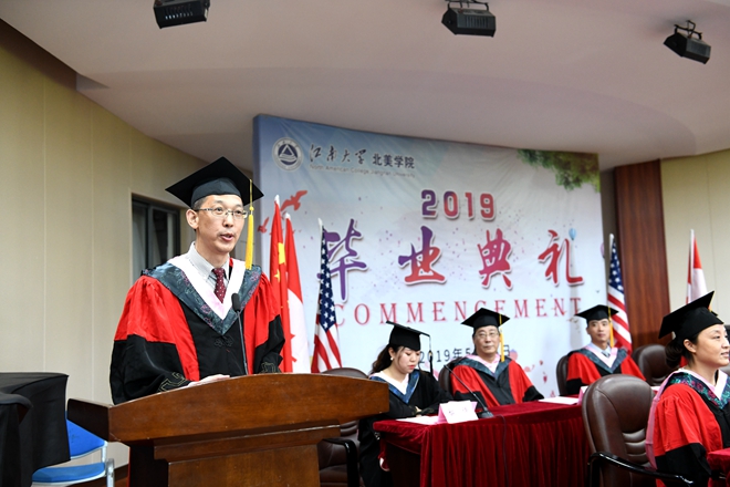 毕业盛典在中华人民共和国国歌声中庄严拉开序幕。院长龚晓斌教授首先致辞,他代表北美学院对2019届所有毕业生表示衷心的祝贺,所有的努力都是有回报的。这四年来所有的经历最终都会变成难以忘怀的一段回忆陪伴着你的成长和发展。同时,大学毕业也只是生命中的一抹逗号,并不是终点站,一切过往皆为序章,美好未来正在等着你们。不论你们身在何方,学院一直与你们同在。最后龚院长也对辛苦栽培孩子的毕业生家长们和全体教师们表示了由衷的感谢。