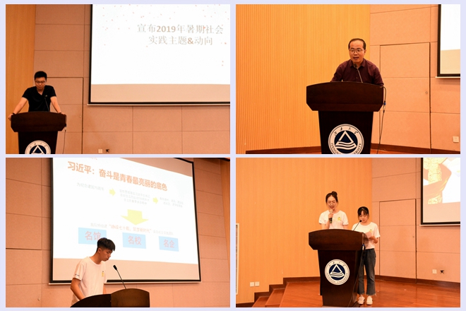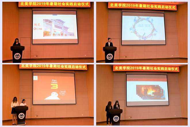 接下来,2019年的七支暑期社会实践团队依次上台展示,发布团队招募相关介绍。2019年是新中国成立70周年,五四运动100周年,海军成立70周年……一串串数字见证着历史的脉络,国家的复兴。因此,北美学院2019年暑期社会实践的七支团队紧紧围绕“壮美七十年,奋斗新时代”为主题,去往北京、南京、上海、陕西、常州、青岛、泰安、嘉兴,在文化、经济、教育等方面策划开展本年度的社会实践活动。