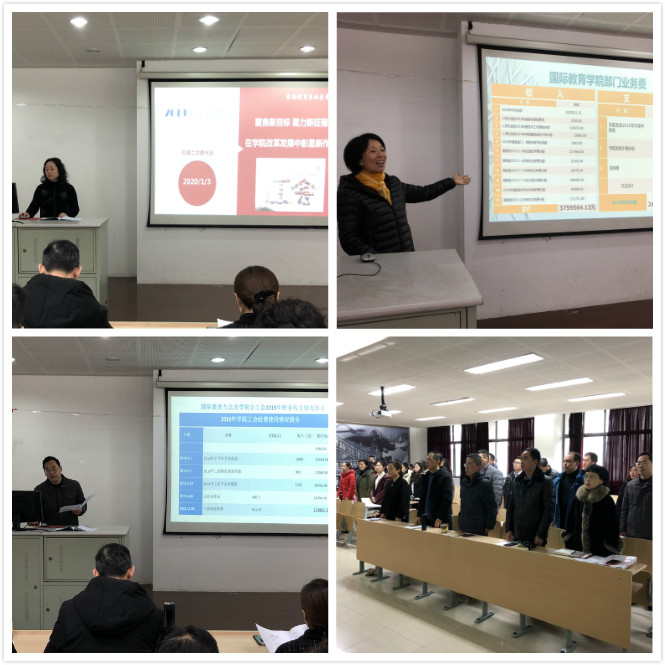 大会在庄严的国歌声中开始。学院院长龚晓斌向大会做了主题为《同心同德 创新实干 共谋发展 为全面推进大国教新局面而努力奋斗》的学院工作报告,从全面提升领导班子能力水平,北美办学稳步提升,来华留学工作不断创新,党政群团工作不断夯实四个方面回顾了2019年学院主要工作以及取得的成绩。朱琳向大会做了主题为《聚焦新目标 聚力新征程 在学院改革发展中彰显新作为》的学院分工会工作报告,从加强师德师风建设,关心教职工成长;打造“教工之家”,营造开放环境;开展各类活动,助推和谐发展等方面回顾了2019年院工会在学院发展中的主要工作以及存在的问题。院办主任秦燕向大家汇报了2019年学院财务报告,分工会副主席顾良玉向大家汇报了工会财务报告,请全体代表审议,全体大表以热烈掌声通过。