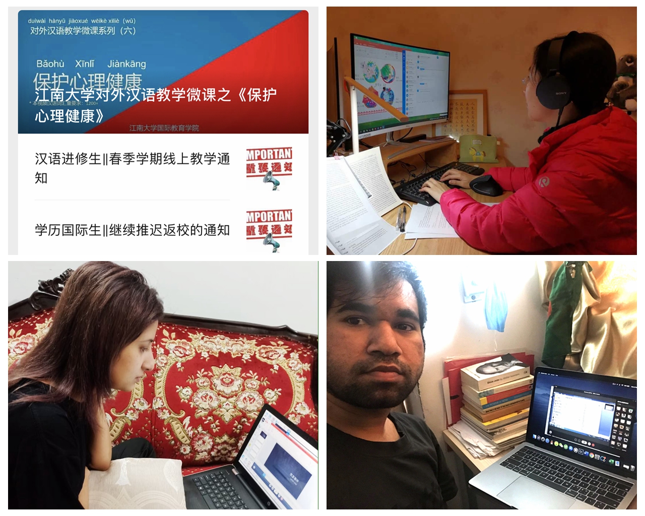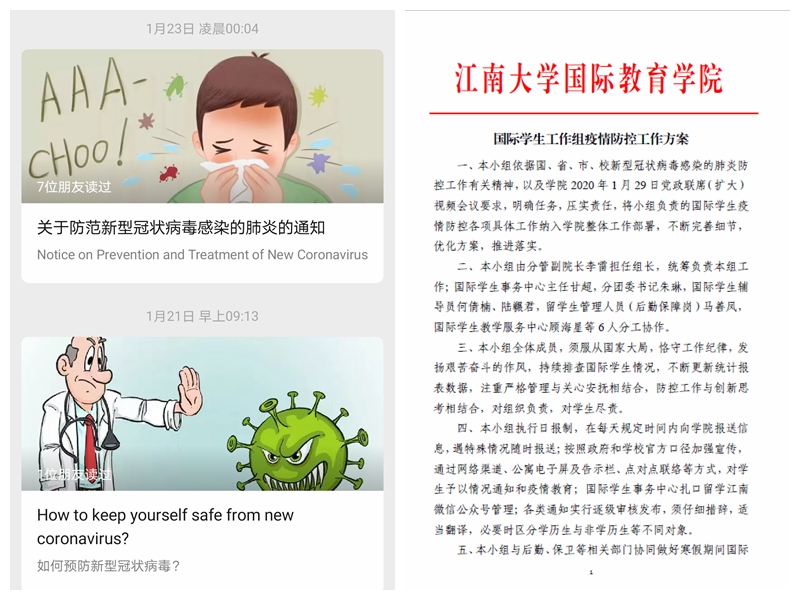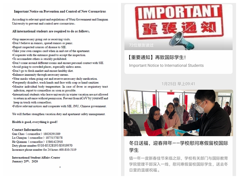 1月22日,“留学江南”微信公众号向全体国际学生推送《关于防治“新型冠状病毒”的提示》中英文版,提出十五点须知。1月23日,国际教育学院向寒假留校国际学生发放春节慰问品及临时采购的一次性医用口罩,提醒大家做好个人防护。有此即时响应和一系列基础性工作,学校、学院对国际学生疫情防控得以心中有数、从容应对。