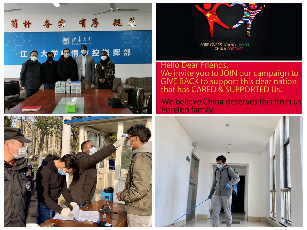 布隆迪籍2002届硕士校友戈壁为母校捐赠一次性医用口罩1000只和善款10000元;来自泰国、越南、印度尼西亚、巴基斯坦、孟加拉国的学子也在家乡主动帮忙购买口罩;江南大学国际学生联合会为母校募捐4500元,同时组织一支十余人的国际学生志愿服务队,协助学校完成防疫物资发放、公共空间消杀、国际学生联络等多项任务。