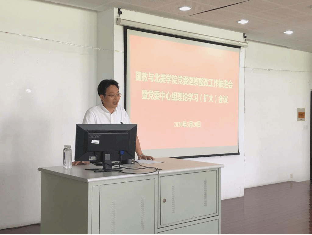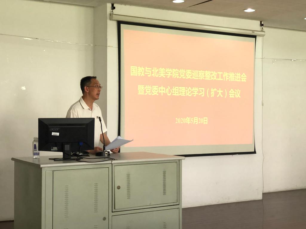 5月20日下午,国教北美学院党委巡察整改工作推进会暨党委中心组理论学习(扩大)会在文科楼206举行。校党委常委、宣传部部长倪松涛,院党委委员,院领导班子成员,各部门负责人、党支部书记、支部委员参加了会议。会议由院党委书记陈琳主持。