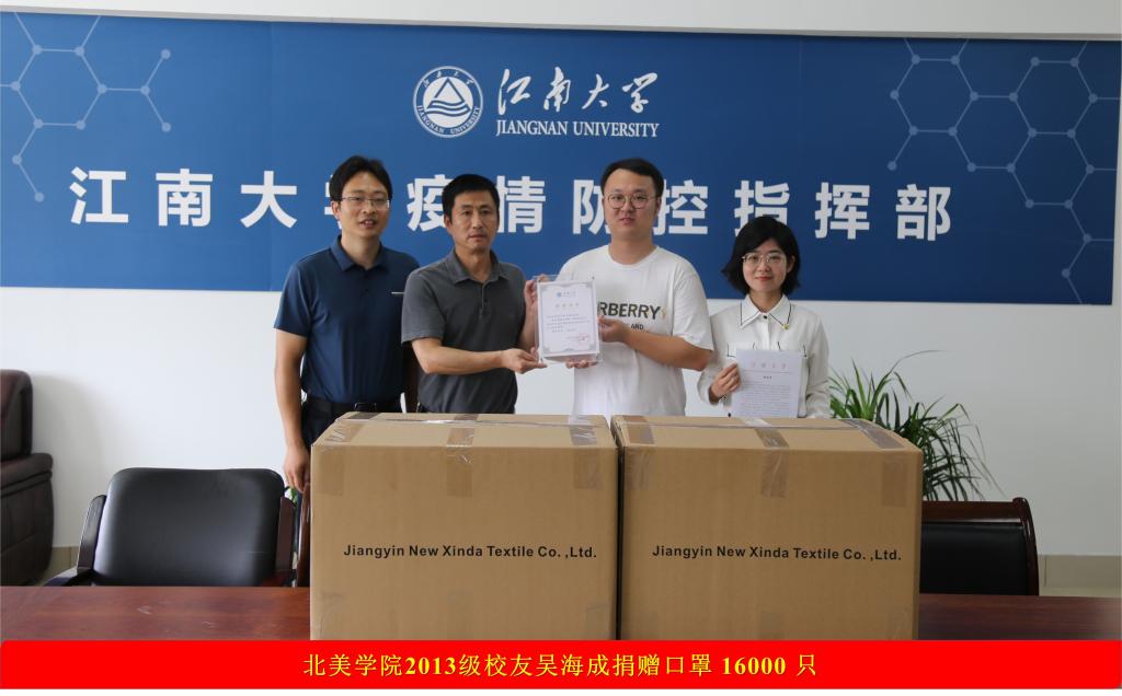 近日,北美学院2013级校友吴海成向学校捐赠口罩16000只。捐赠仪式在学校行政楼A306举行,校党委副书记戴月波亲切接见并代表学校接受捐赠,国际教育与北美学院党委书记陈琳出席了本次捐赠仪式。