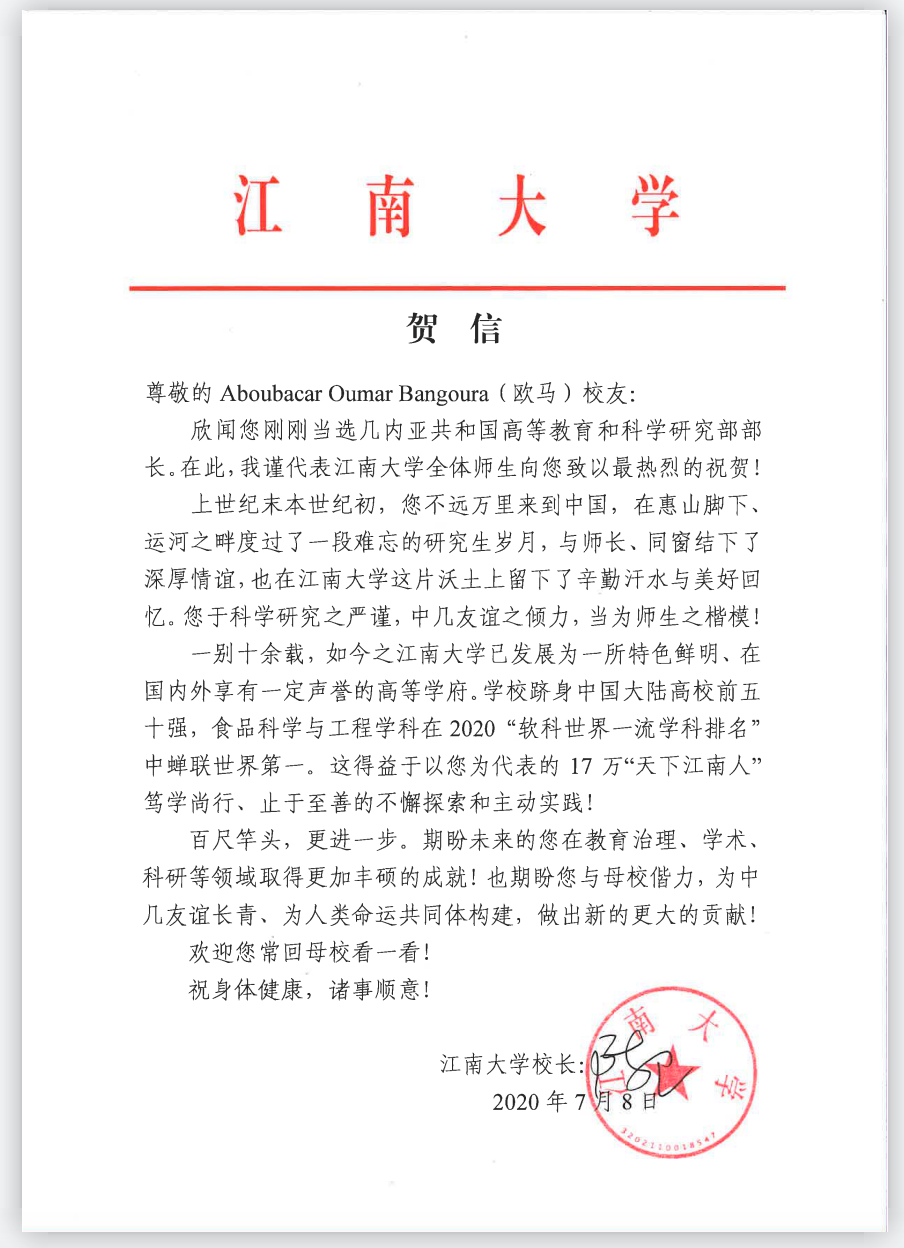 近日,我校几内亚籍校友、2005届博士毕业生、2000届硕士毕业生,不久前刚刚当选几内亚共和国高等教育和科学研究部部长的Aboubacar Oumar Bangoura(中文名:欧马)与校长、中国工程院院士陈卫互通信函,致以问候。
