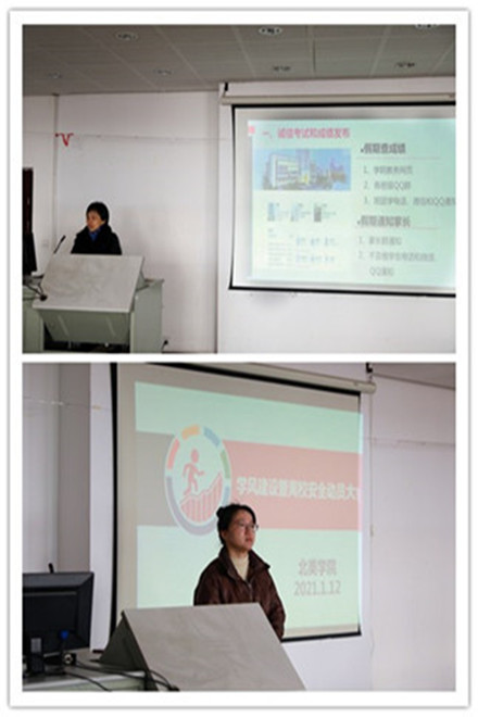 1月12日中午,北美学院分别召开2018级学风建设动员大会和过关考试“1+1”帮扶座谈会。学院党委副书记、副院长荆燕和副院长周伟、教务部陆晓斐出席了会议,参加会议的有2018级、2019级班团学主要学生骨干和英语过关考试未通过学生。会议由辅导员顾海星老师主持。