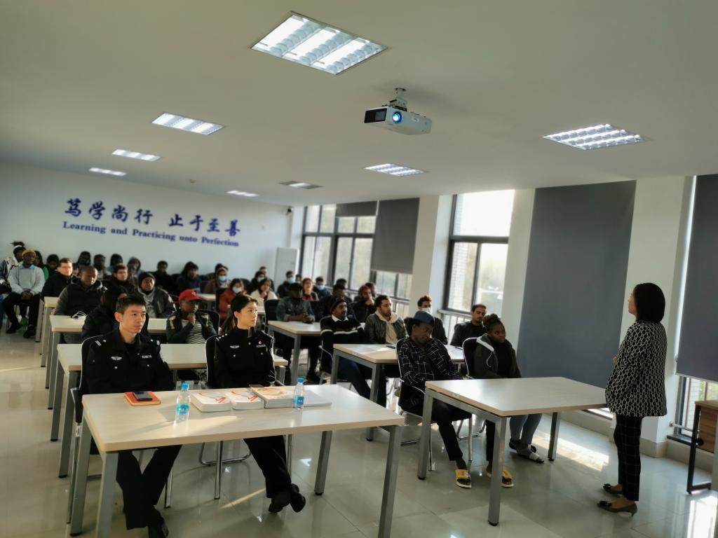 张莉向同学们详细介绍了外国人来华签证、居留许可等相关法律法规,以及公共秩序和社会治安相关案例,提醒大家知法懂法、遵纪守法。警官通过宣讲视频向同学们解读新冠肺炎疫情防控政策,叮嘱大家积极配合疫情防控、加强自我防护意识。在互动问答环节,同学们踊跃发言,就切身相关问题与警官进行交流。李星諓、张莉还向同学们赠送了出入境服务专刊以及中国概况相关书籍。