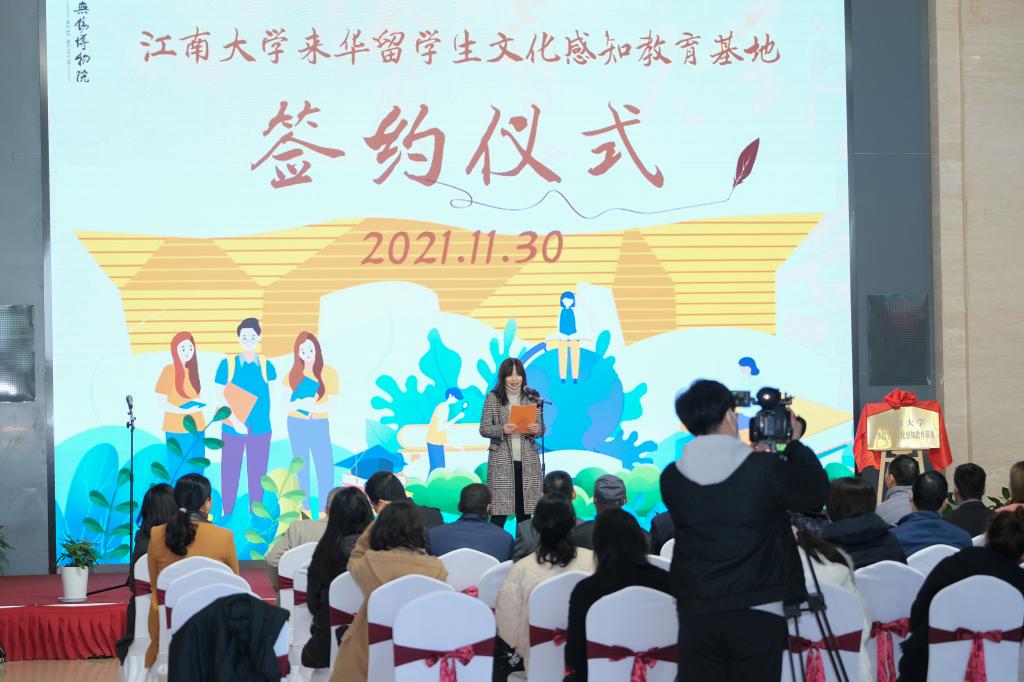 仪式伊始,在双方领导、与会人员的见证下,肖炜和周伟共同签署了《江南大学国际教育学院与无锡博物院来华留学生文化感知教育基地协议书》。龚晓斌和肖炜为基地揭牌。