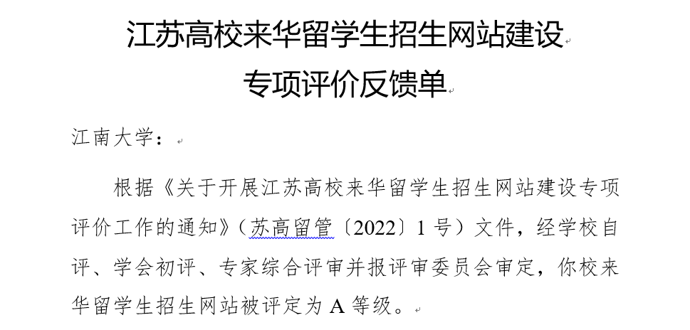 近日,由江苏省高等教育学会、外国留学生教育管理研究委员会组织开展的“江苏高校来华留学生招生网站建设专项评价工作”,通过学校自评、学会初评、专家评审等环节,经评审委员会审议,我校来华留学生招生网站被评为优秀和A等级。据悉,全省共有87所高校参加了来华留学生招生网站建设专项评价工作,最终20所高校被评为优秀,其中15所被评定为A等级。