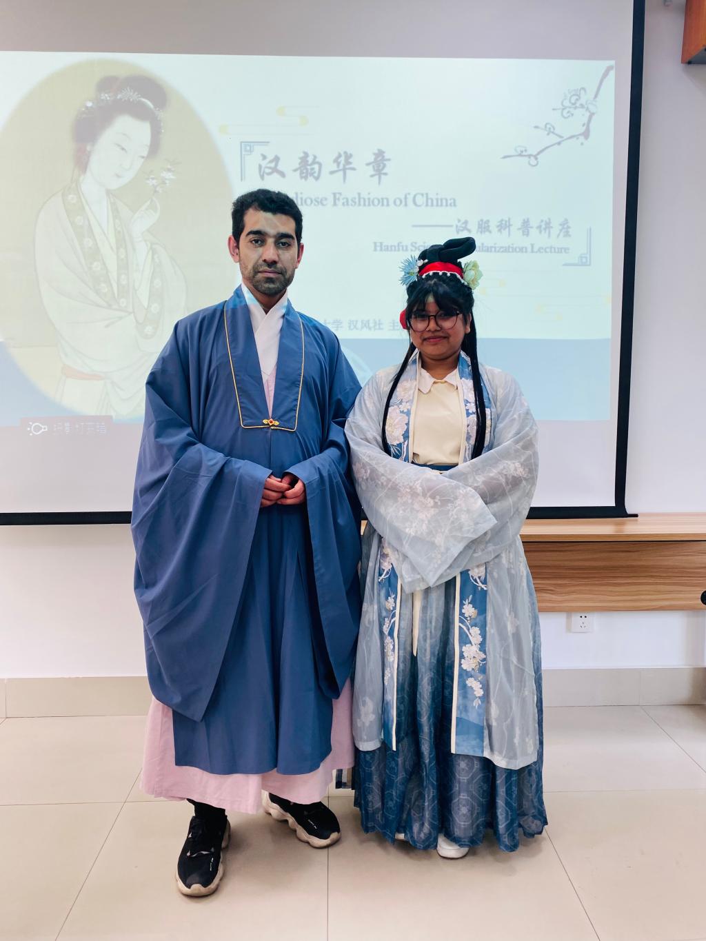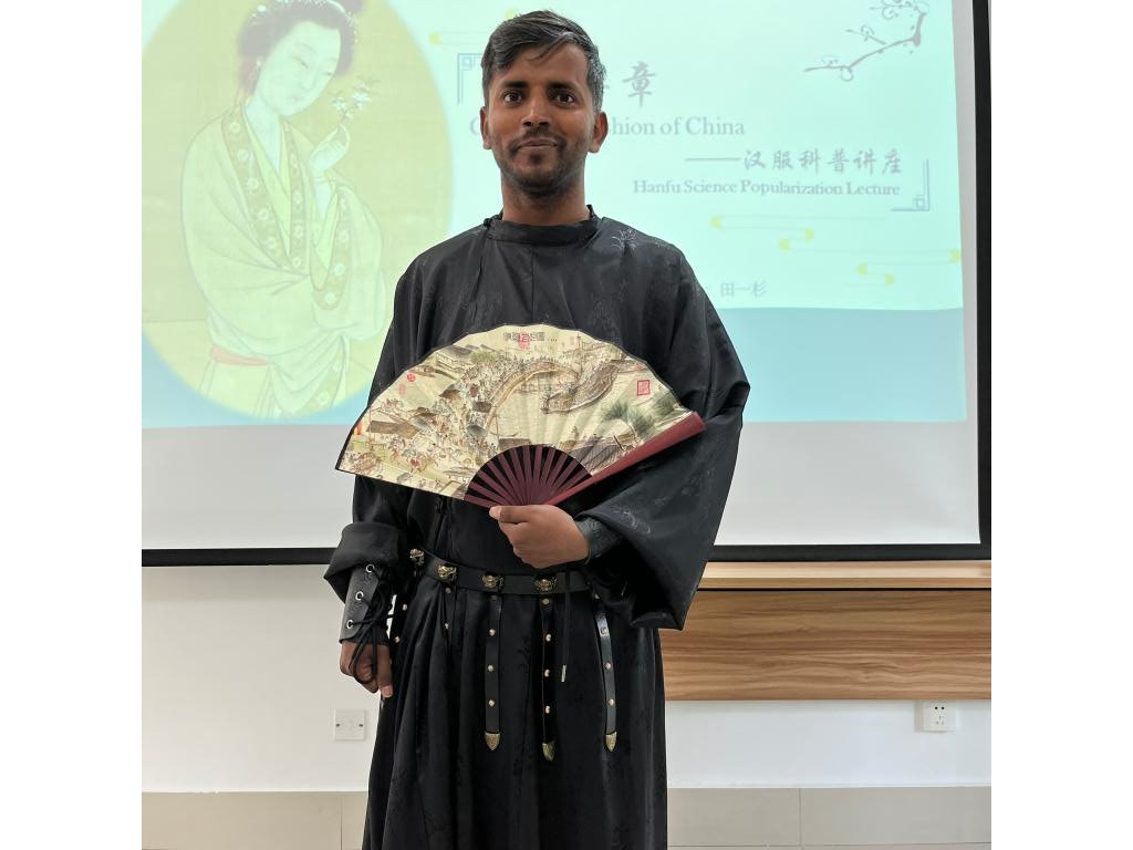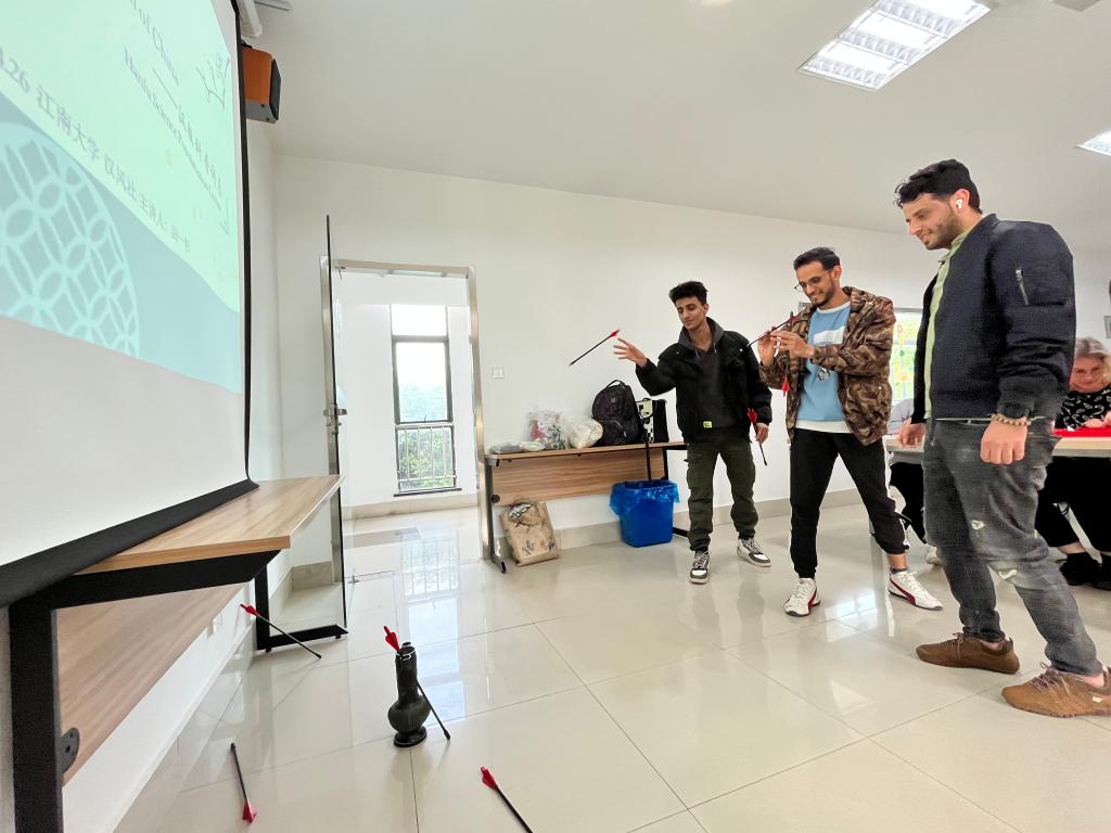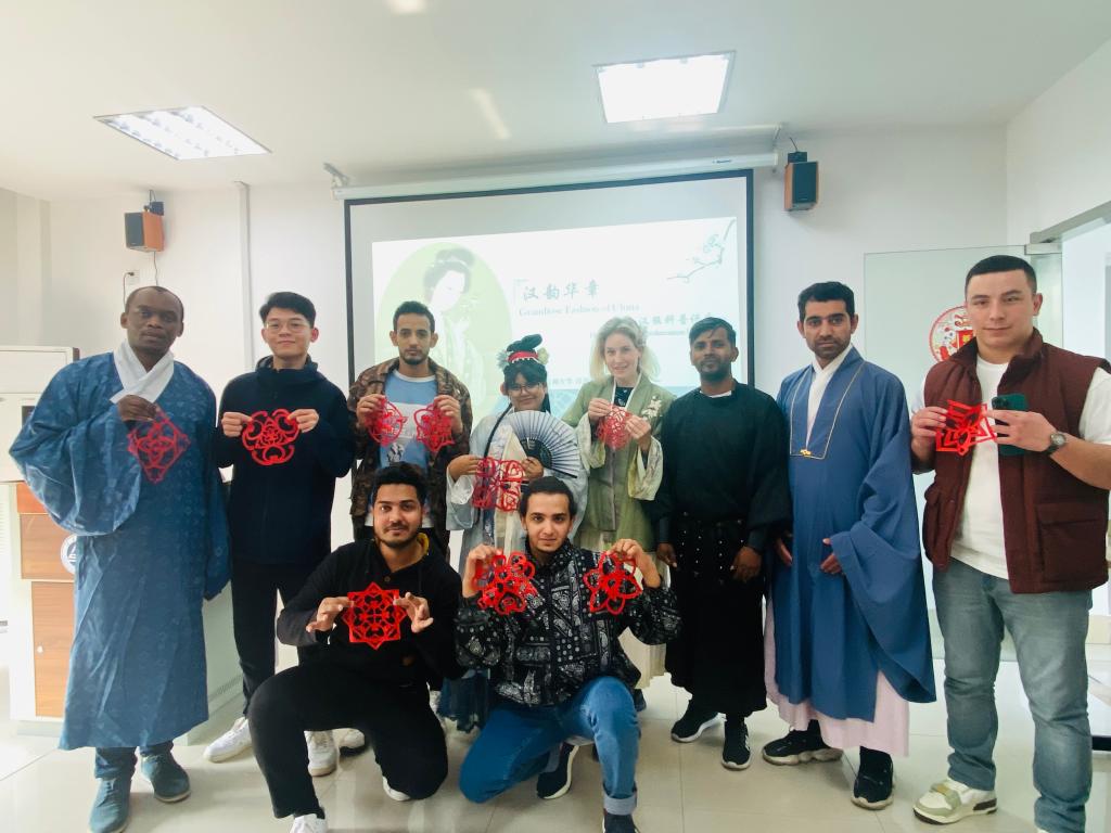 罗衣何飘摇,轻裾随风还。来自奥地利、巴基斯坦、越南、孟加拉国等国的15名国际学生,在校汉服社同学的带领下,穿越千载岁月,了解中国不同朝代、不同形制的汉服及背后的文化意蕴,感受华夏礼仪之博大。国际学生还进行了汉服试穿,体验了褒衣博带、华美飘逸的服饰,敷铅粉、画黛眉、点绛唇的妆造。在随后的投壶和剪纸游戏中,大家踊跃参与,走进中国古人的娱乐活动之中,充分感知汉服之美、汉礼之韵、投壶之趣、剪纸之巧,亲身体验体中国优秀传统文化的魅力及传承创新,感受到华夏民族礼仪之邦的风采。
