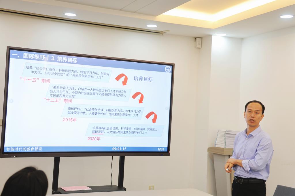 学校教务处副处长吴宝锁结合自身多部门岗位锻炼的收获和感受,以《智能时代的教育管理》为题,围绕国际视野、未来思维、江南情怀三个方面,强调要增强条线工作合力,激活学院工作动力,激发学生学习潜力,强化规章制度引力,提升智能服务能力。