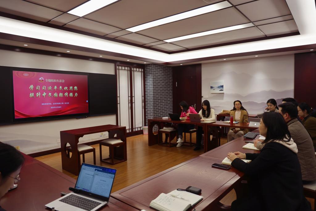 11月30日下午,国际教育学院、北美学院教工第二党支部在二教楼2C222国学教室开展“学习贯彻习近平文化思想、提升中文国际传播力”专题组织生活会,传达习近平总书记对宣传思想文化工作作出的重要指示精神,深入学习研讨习近平文化思想。会议由教工二支部书记王利峰主持,融媒体中心主任兼党委宣传部副部长胡振宇到会督学。
