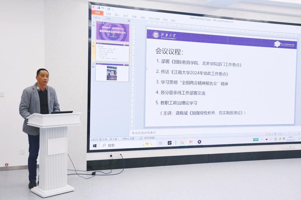 国际教育学院、北美学院院长龚晓斌部署《2024年度国际教育学院、北美学院工作要点》,他希望各部门加强党的政治建设,强化来华留学招生工作,完善育人体系建设,落实教学管理制度,拓展教育培训载体,努力造就“四有”好教师团队。