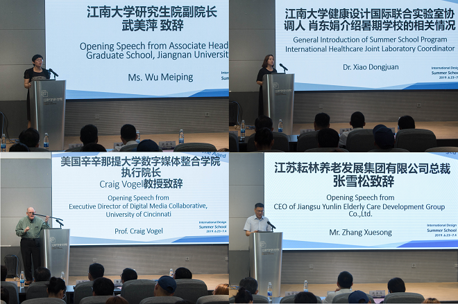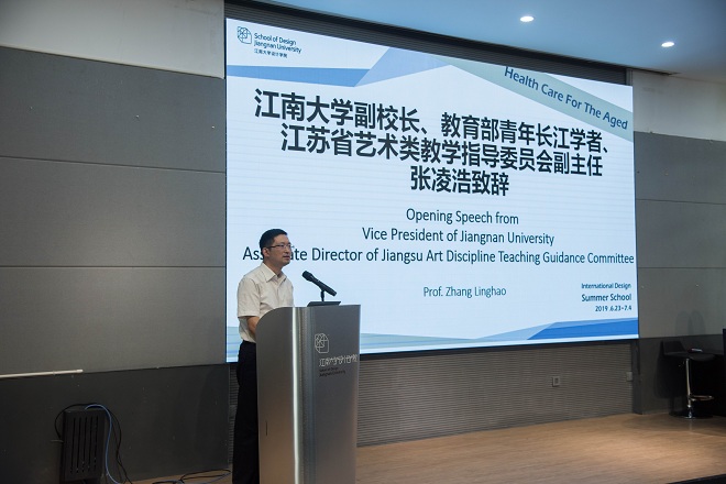 最后,张凌浩教授致辞,他表示本次研究生暑期学校受江苏省艺术类教学指导委员会的委托,在江苏省内充分发挥名校资源和优势,将江苏省内外众多学校研究生以及英国高校学生汇聚在江南大学,为学生在暑假提供能力提升、视野拓展以及协作方面训练的一个绝佳机会。江南大学非常重视跨学科优秀研究生培养,每年都会举办跨学科协作暑期学校,并通过国际夏季班促进国际院校的合作。江南大学旨在推动区域发展,基于问题、趋势、教学逻辑及伦理进行综合性、交叉性的学术活动,2019年研究生暑期学校的主题是基于健康养老的体验系统设计,这是一个跨学科跨文化的夏令营活动,希望以我们的同理心去感受和设计老年人的生活方式,去想象适合于未来的解决方案。