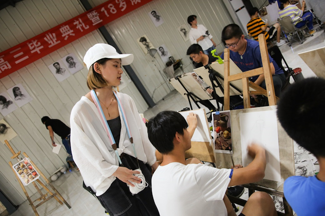 为了了解学中学生们真实的专业水平,给予更多有效的指导,实践团队的成员们跟随学生们来到了高一美术班的画室,与学弟学妹们进行亲切交流,倾听他们的艺术困惑,分享自己的学习经验,手把手地指导他们作画。