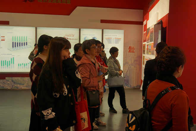 恰逢博物院开展庆中华人民共和国成立70周年成就展。师生们在讲解员的带领下回顾了那段可歌可泣的光辉历程。展览主要分为“太湖明珠·锡城岁月”、“强富美高·奋力领跑”、“璀璨无锡·各领风骚”三个篇章,包含了文字介绍、图片展示、视频展览等多样的展品:“神威·太湖之光”实物模型、浓缩无锡构筑全国性综合交通枢纽新格局的沙盘……展览充分展现了无锡市在新中国成立七十年以来在经济上取得的巨大成就,展现了一个国家从站起来、富起来到强起来的伟大突破,生动诠释了中国共产党为人民谋幸福、为民族谋复兴的初心和使命。这些辉煌灿烂,壮怀激烈的历史故事再次感染了在场的师生。关工委老师和同学们共同回顾历史,勉励团员青年加强学习,立足事业,扎扎实实、规规矩矩走好人生路。