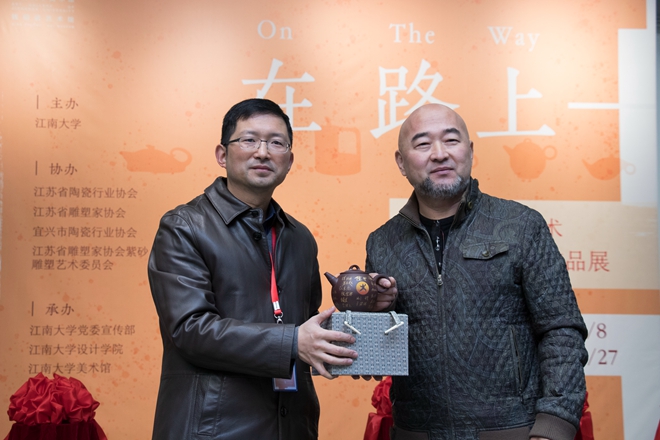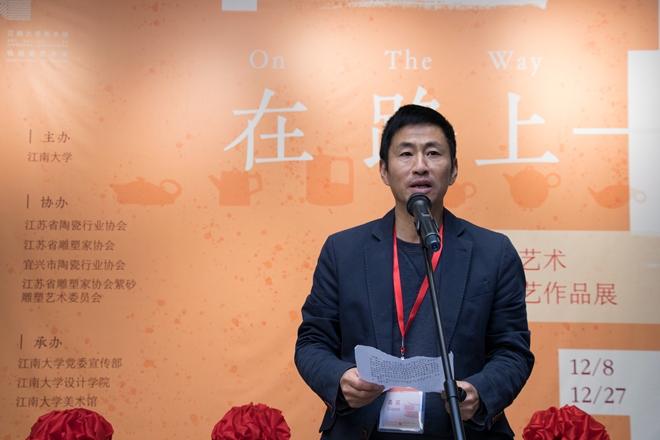 2019年12月8日,“在路上——葛军紫砂艺术及国际壶艺术作品展”开幕式在江南大学美术馆举行。原中国人民解放军某部总工程师张忠华将军、省美术家协会副主席陆庆龙,省委宣传部原部务委员、办公主任张冠军,中国陶瓷行业协会副会长、宜兴市陶瓷行业协会会长史俊棠,荷兰著名陶艺家杨慕华,校党委副书记戴月波,副校长张凌浩,院长魏洁以及学院师生代表等出席开幕式。开幕式由学院党委书记邱建平主持。
