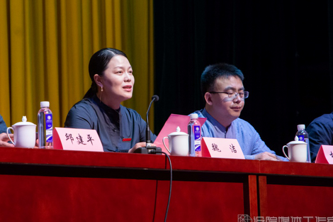 服装工程2001班蒋阗行代表本科新生发言,她愿同学们能够扎实基础,打破常规的思维,在追逐至善的人生路上永不停歇;希望同学们要以学习为主,学会自我学习,以更高的目标要求自我;愿同学们能在最好的时代引领属于他们的方向。设硕2007班赵振皓代表研究生新生发言,他希望新生们能够保持大学生涯的那份好奇心和求知欲,跳出思维束缚;吸收学习新的知识以及技术,保持设计学科交流的特色,为江南大学设计学院,为中国设计,走出更多熠熠生辉的灿烂时刻。教师代表服艺2003班班主任吴欣老师表达了对新生的美好期望。在她看来,设计是为社会服务,为人服务的,一个好的作品离不开设计者的情怀与温度;希望新生们自主学习,学会主动实践、总结实践经验,培养正确的人生价值观,做一个乐观、豁达、遇事拿得起、放得下的人。研究生优秀导师代表李栋宁教授也通过洞穴寓言鼓励同学们打破常规,积极探索无限可能。他借用国学大师王国维语录“古今之成大事业、大学问者,必经过三种之境界”引导学子们认识学无止境的内涵并寄语学子们多读书、读好书,要脚踏实地将远大抱负落实到具体的设计实践中。