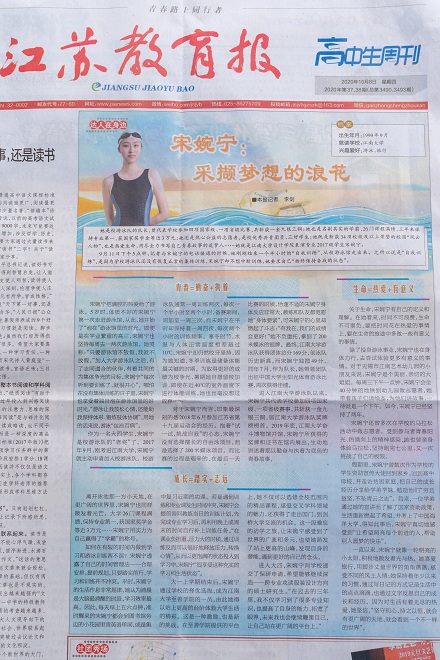 近日,我校设计学院宋婉宁同学先进事迹被《江苏教育报》重点报道。报道以《采撷梦想的浪花》为题,从“青春、成长、生命”三个维度讲述了宋婉宁以勤奋与执着为底色的奋斗故事。