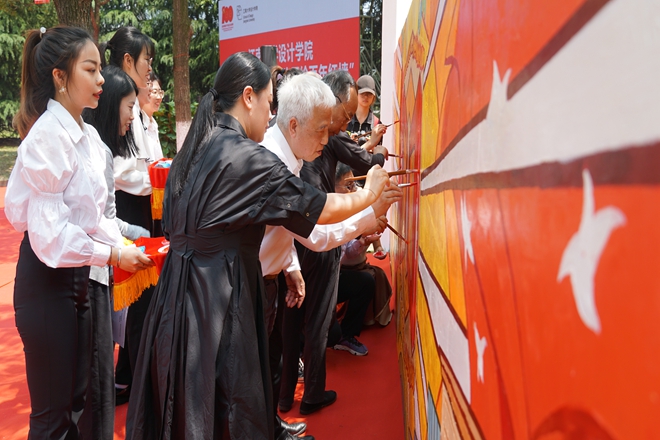 墙绘设计指导老师代表、公共艺术与美术系原党支部书记徐晴副教授和视传2003班学生代表郭慧蕾同学分别进行“百年红墙”主题墙绘项目介绍,分享了“百年红墙”的创作思路和创作历程。随后,朱飞、张福昌、过宏雷、贾蕾蕾、过伟敏、魏洁、范晓莉等7位教师代表和学生代表李睿璇等来到红墙前,共同完成绘制百年红墙,师生携手,为百年红墙留下浓墨重彩的一笔。