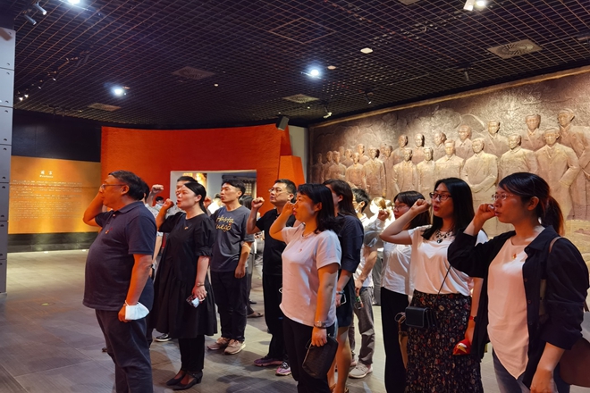 一行人首先参观了“肩负民族复兴期望的无锡人”专题展区,聆听了包括陆定一、秦邦宪、王选、荣毅仁等在内的13位在民族复兴大业中做出卓越贡献的无锡籍仁人志士的革命史、奋斗史,通过一件件历史文物和一个个生动的故事,深切感怀了先辈们为祖国、为民族发展奋发图强的奋斗精神和为国为民不惜牺牲一切的坚定品格。随后,一行人透过“血与火的城市记忆——无锡革命简史”专题展区,了解了无锡人民在中国共产党领导下进行新民主主义革命的艰难曲折历程,和从五四运动直至无锡解放的壮丽历史画卷。在鲜红的党旗下,全体人员在党委书记邱建平带领下,重温了入党誓词,坚定入党初心。