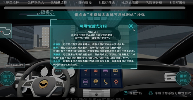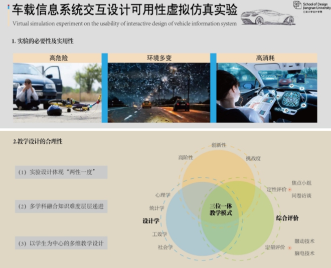 《基于虚拟仿真的车载信息系统交互设计可用性研究》项目为国家一流专业产品设计和工业设计《用户体验设计和可用性测试》课程的核心教学课程实验内容,从实验课程分为实验目的、实验操作、实验评价3个部分。主要以理论分析为核心,数值计算为基础,构建系统建模为重点,最后进行实验验证和设计迭代。能够有效的锻炼学生的实验设计逻辑思维、数据搜集和统计分析的能力。该项目通过开发车载信息系统虚拟仿真的实验,解决实操危险成本“双高”的难题,并且引导学生自主学习夯实专业基础,鼓励学科多维融合创新,因此具有很强的实用性。