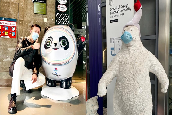 春季返校同学忽然发现,学院里请来了校友领衔设计的“冰墩墩”,与冰墩墩合影时,它还不忘提醒:“少聚集”“戴口罩”。学院楼前的大白熊也应景地带起了“设计口罩”。