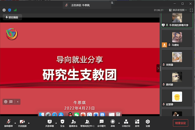 4月23日下午,设计学院成功举办2022年职业导航季首场活动“导向就业分享会”,作为设计学院特色项目,聚焦“选调生”“西部计划”“参军入伍”多项基层就业,邀请了成功“上岸”的学长学姐与同学们相聚“云端”,围绕考试准备、面试技巧、心路历程和自我收获等全方面多角度与大家交流分享。本次线上云分享会由设计学院辅导员马倩如主持,设计学院本硕共计300余位同学在线共同参与聆听。