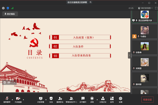 最后,设硕2001班龚正同学作为参军入伍代表,从入伍政策、入伍的条件和流程、个人成长三个方面,结合自己曾在陆军特战部队2年的服役经历和同学们进行了深入的交流。他提到,虽然服役期间很辛苦,但是无论是在思想上还是身体素质上,对于自己个人的成长,人生的规划带来的很大的改变,他鼓励同学们,积极响应国家号召,参军服役,投笔从戎、精忠报国。