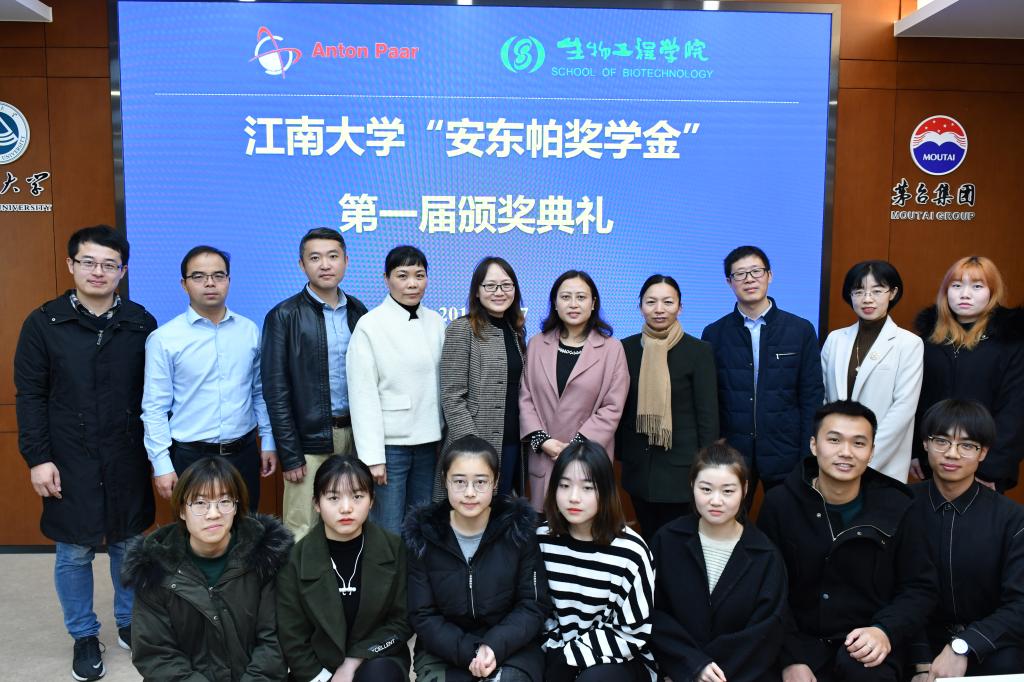 2019年12月17日下午,江南大学第一届“安东帕奖学金”颁奖典礼在生物工程学院茅台厅举行。安东帕(上海)商贸有限公司销售副总程张红、市场部经理畅良艳、实验室销售经理陈希、在线产品经理张锴、江苏省销售梁永奇、生物工程学院党委书记黄壮霞,江南大学产业技术研究院副院长、酿酒工程专业责任教授李崎及获奖学生参加颁奖典礼,颁奖典礼由葛玲老师主持。