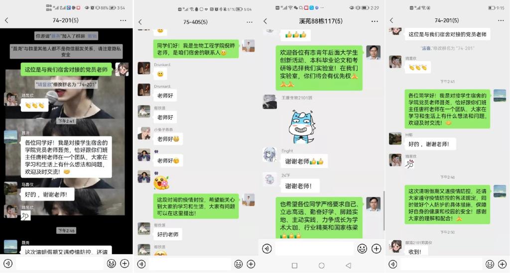 酿酒2101班邓美仪同学说,“跟我们宿舍对接的聂老师组建群组后就很关心我们的身心健康,让我们感觉到了温暖,像一阵春日清风,缓缓吹开心头的雾,让我们知道,学校和老师会一直陪伴我们。这给了我们很大的安慰,为我们注入信心去面对疫情防控常态化下的管理和线上学习。”