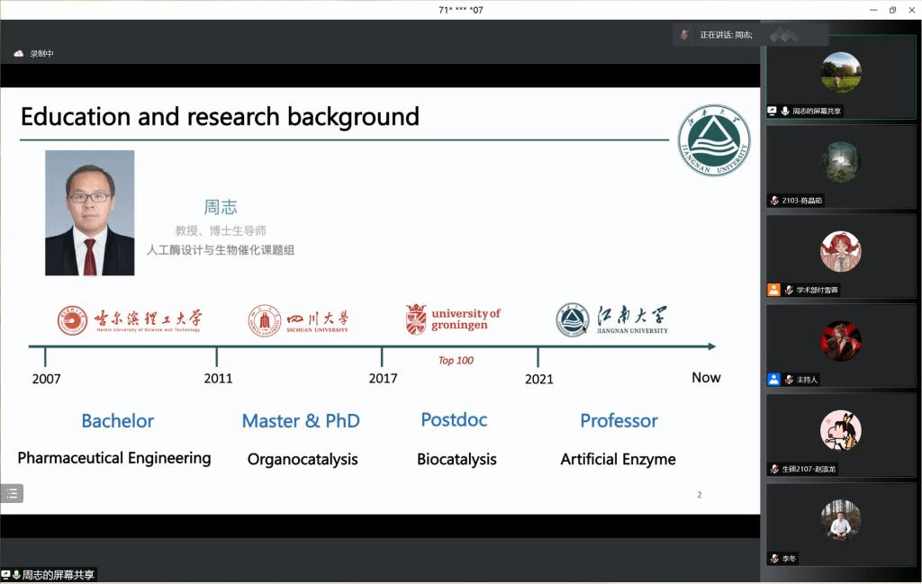 主讲人周志教授,于2021年加入江南大学开展独立科研工作,主要研究方向为新型人工酶设计与催化,致力于发展酶催化的非天然反应研究。至今以第一或通讯作者身份在国际著名期刊Nature Catalysis, Nature Chemistry,ACS Catalysis, Angew. Chem. Int. Ed.等上发表研究论文数篇。目前负责“合成生物学”重点专项青年项目子课题一项。