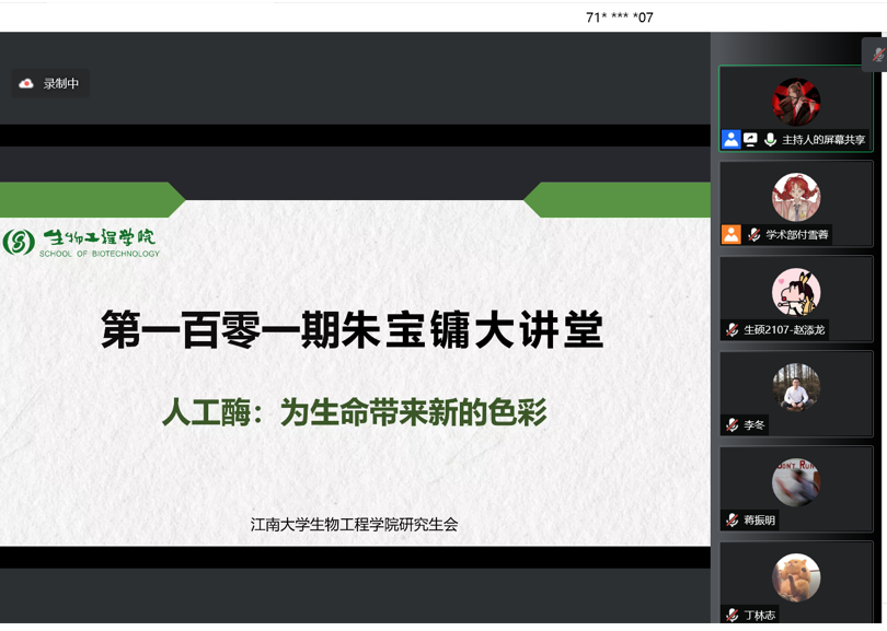 为开拓同学们的学术视野,丰富课余文化生活,生物工程学院于4月18日以腾讯会议直播的形式举办了第101期朱宝镛大讲堂。本次讲座邀请到了江南大学生命科学与健康工程学院教授、博士生导师周志老师为大家带来“人工酶:为生命带来新的色彩”主题要闻。