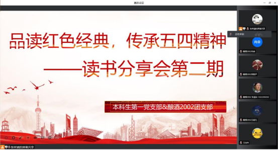 5月6日晚,生物工程学院本科生第一党支部与酿酒2002“赤水河”特称团支部,以“品读红色经典,传承五四精神”为主题举办读书分享会。来自党支部和团支部的7名同学依次进行分享,学院200余名同学线上参与,大家在书籍中与前人思想交汇,启迪思想,在红色经典中学习百年党史,坚定信念。