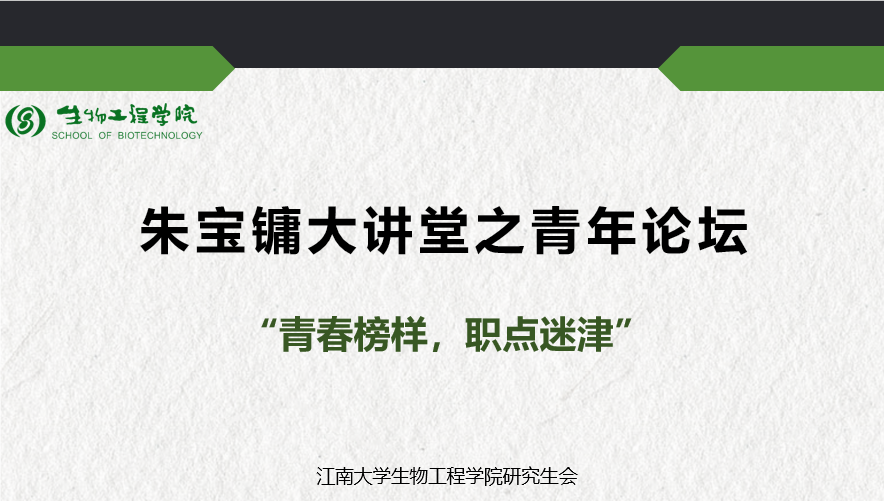 主讲人卢连登学长,中共党员,曾任生物工程学院研究生会主席,江苏省“大学生青马工程”第十三期培训班学员,现任宝洁黄埔工厂口腔护理品类风险经理。分享伊始,卢连登以“做不可替代的人”为标题开篇,将大家引入了毕业求职的时期,并结合自身经历,为大家详细介绍了职业分类,选择标准等问题。在求职的过程中,我们可能面对的各种类型的公司以及五花八门的面试方式。在判断的过程中,我们要结合自身因素以及质朴的想法,选择最满足自己心中期待的工作。随后,卢连登学长结合自己在宝洁的工作经历,为我们畅谈了自己的工作感悟,学长儒雅随和,幽默风趣。叮嘱我们,在入职前要为人生新阶段储能,在入职后需要从学生思维向职业经理人思维转变从必然王国向自由王国发展。在互动交流环节,面对同学们关于职业规划和怎样平衡工作与生活方面新奇且丰富的问题,卢连登学长以其独特的幽默语调,以及卓越的理解为大家带来了详尽的解答。鼓励大家在生活与工作中脚踏实地、锐意进取。