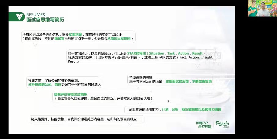 同心抗疫,“职”面未来。5月12日晚,生物工程学院第九届“职场问道”系列讲座第四期“外企管培面试官教你用面试官的思维写简历”以腾讯会议加直播的形式在线上顺利举办。来自全球第三大啤酒公司嘉士伯集团的嘉士伯中国人力资源经理聂俊杰、嘉士伯中国招聘专员王诗言受邀做主题分享。嘉士伯中国人力资源经理李芳菊、学院党委副书记周云龙、辅导员陆燊佳,以及500余名学生参加活动。