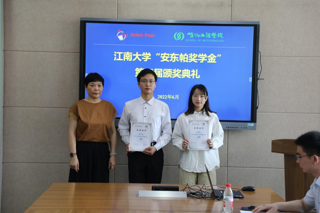 6月8日上午,江南大学第三届“安东帕奖学金”颁奖典礼暨云端校企交流会以线上线下相结合的形式举行。安东帕(上海)商贸有限公司市场部经理畅良艳、实验室销售经理陈希、销售副总程张红,生物工程学院李崎教授、副院长陈献忠、钮成拓副研究员及获奖学生参加活动,会议由辅导员张同舟主持。