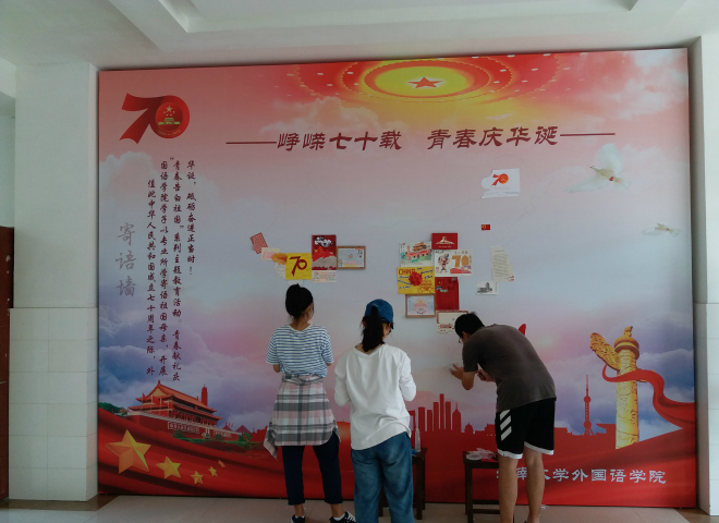 为隆重庆祝中华人民共和国成立70周年,大力弘扬以爱国主义为核心的伟大民族精神,深切感悟新中国70年风雨历程和伟大成就,进一步激发青年学生爱国之情,强化爱国之志,实践报国之行,外国语学院在研究生、本科生各个班级中组织开展了国庆歌咏比赛、寄语祖国手卡制作、微视频作品等“青春告白祖国”系列活动。