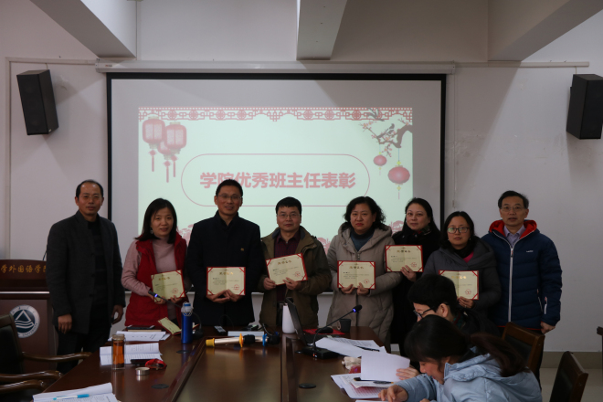 随后杨艳就2019年学院学生工作进行总结汇报。她从班级建设、学风建设、团支部建设等方面回顾了2019年的工作,具体解读了学校班主任工作条例、优秀班主任评选办法等文件,宣读了2018-2019学年获奖班主任名单。黄城芳、刘伯贤为获奖班主任老师颁奖。