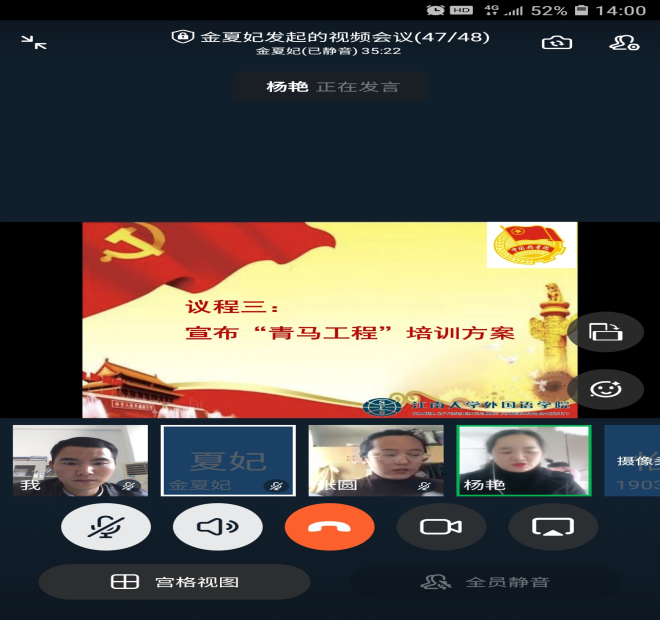 2020年4月15日下午1:30,江南大学外国语学院青年马克思主义者培养工程训练营(以下简称院“青马工程”)开班仪式在钉钉平台举行。学院党委副书记、副院长刘伯贤,分团委书记杨艳,辅导员苗文建以及本期43名青马训练营成员参加“云端”开班仪式。开班仪式由分团委副书记张圆主持。