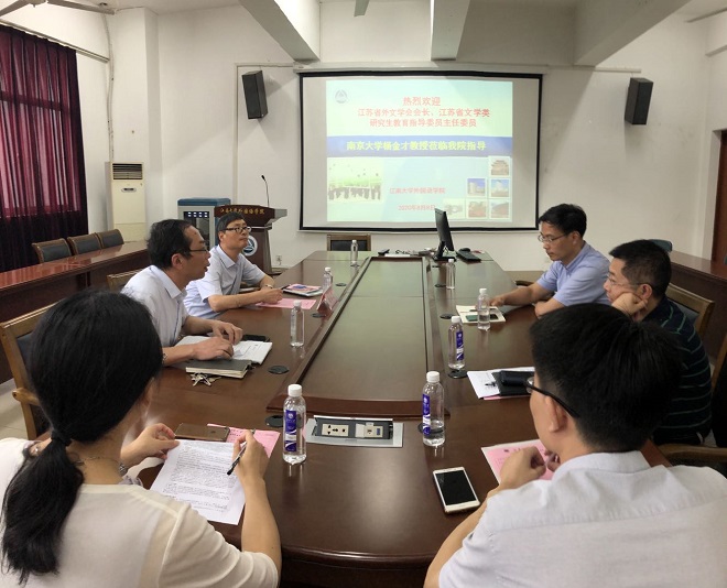 8月8日,受朱庆葆书记邀请,南京大学专家团莅临江南大学指导学科建设,就人文社科校际合作发展进行研讨交流。下午,南京大学原外国语学院院长,博士生导师杨金才教授在方文开院长的陪同下来到外国语学院大会议室,就学科评估和学位点建设等问题进行指导和交流。学院班子成员史志洪书记、谢竞贤副院长、朱义华副院长,英语系与日语系主任,文学方向教授和博士参加了会议。