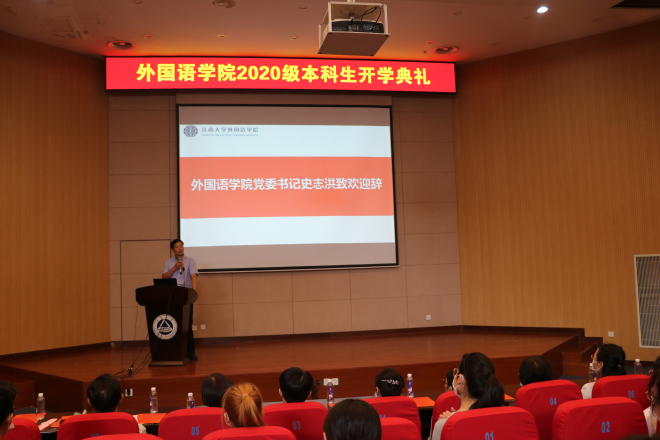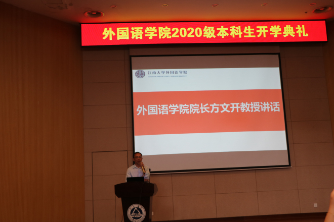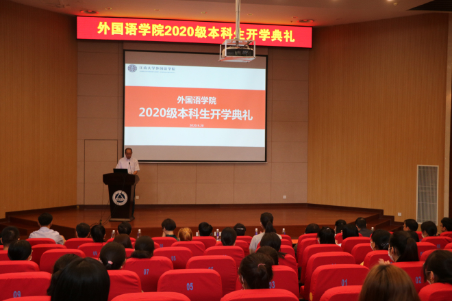 9月20日上午,外国语学院2020级新生开学典礼在远东报告厅举行。外国语学院领导班子全体成员、学院教授代表、专业系主任、两办主任、学工辅导员、班主任以及20级全体新生参加开学典礼。开学典礼由党委副书记、副院长刘伯贤主持。